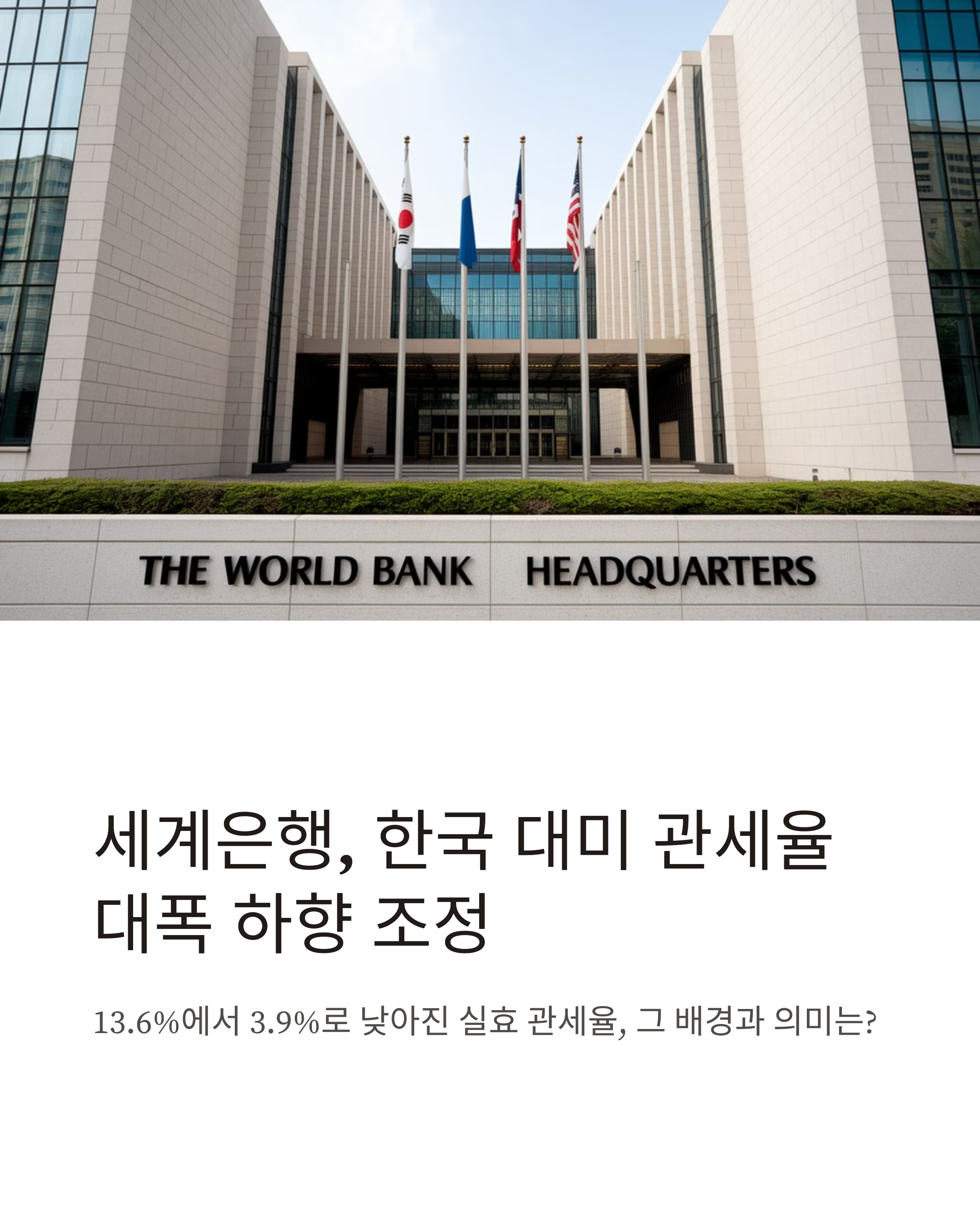 세계은행(WB)이 한국의 대미 실효 관세율을 기존 13.6%에서 3.9%로 수정했습니다. 이는 한국 정부가 제기한 문제를 반영한 결과로, 잘못된 통계로 인해 한국이 미국산 제품에 높은 관세를 부과한다는 오해를 해소하는 계기가 되었습니다.
