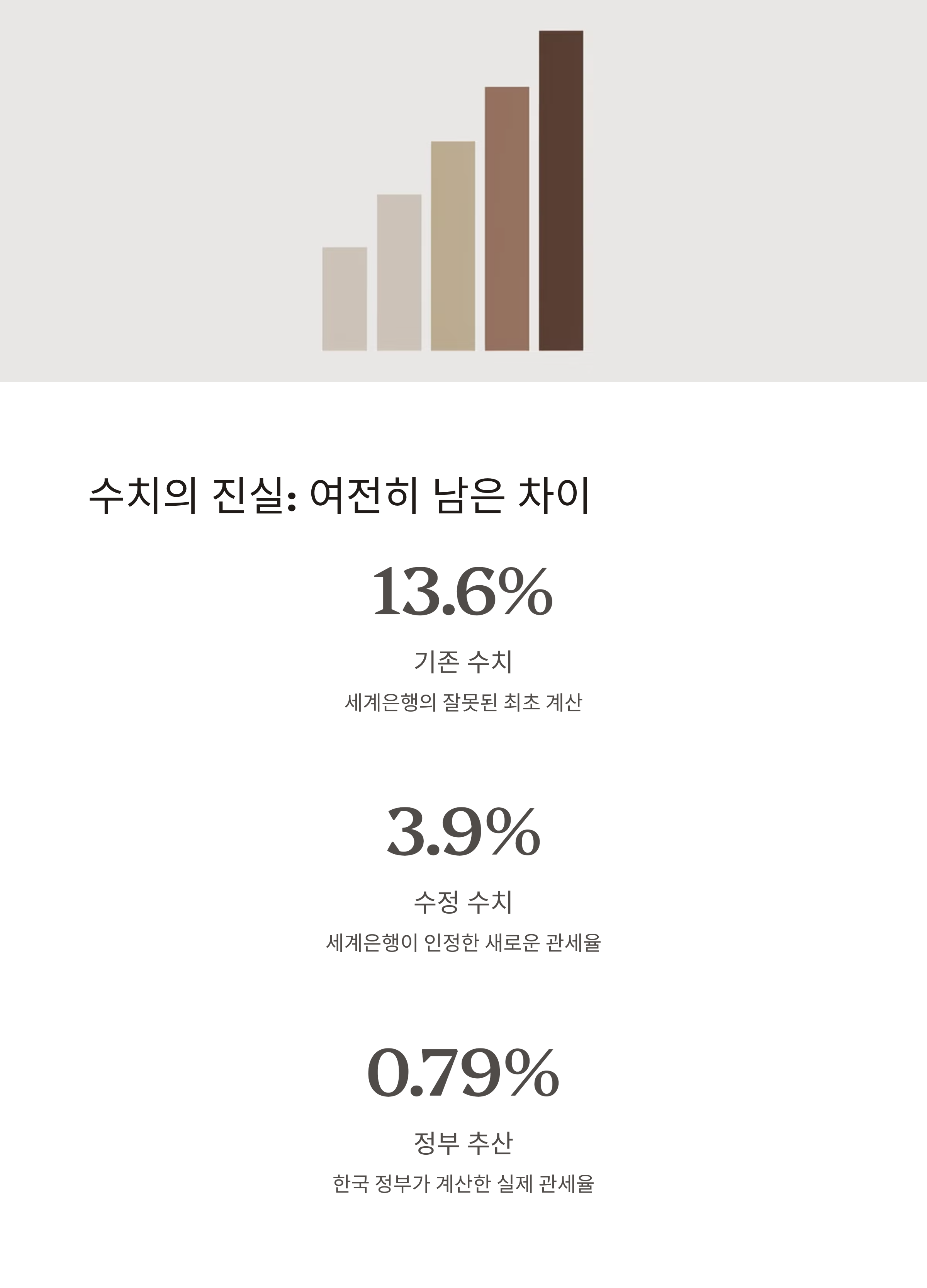 그러나 한국 정부가 자체적으로 계산한 수치(0.79%)와 여전히 큰 차이가 있어, 세계은행의 관세 산정 방식에 대한 논란은 여전히 남아 있습니다. 잘못된 통계는 단순한 수치 오류가 아니라, 국제 통상 관계 및 외교 정책에도 영향을 미칠 수 있습니다.