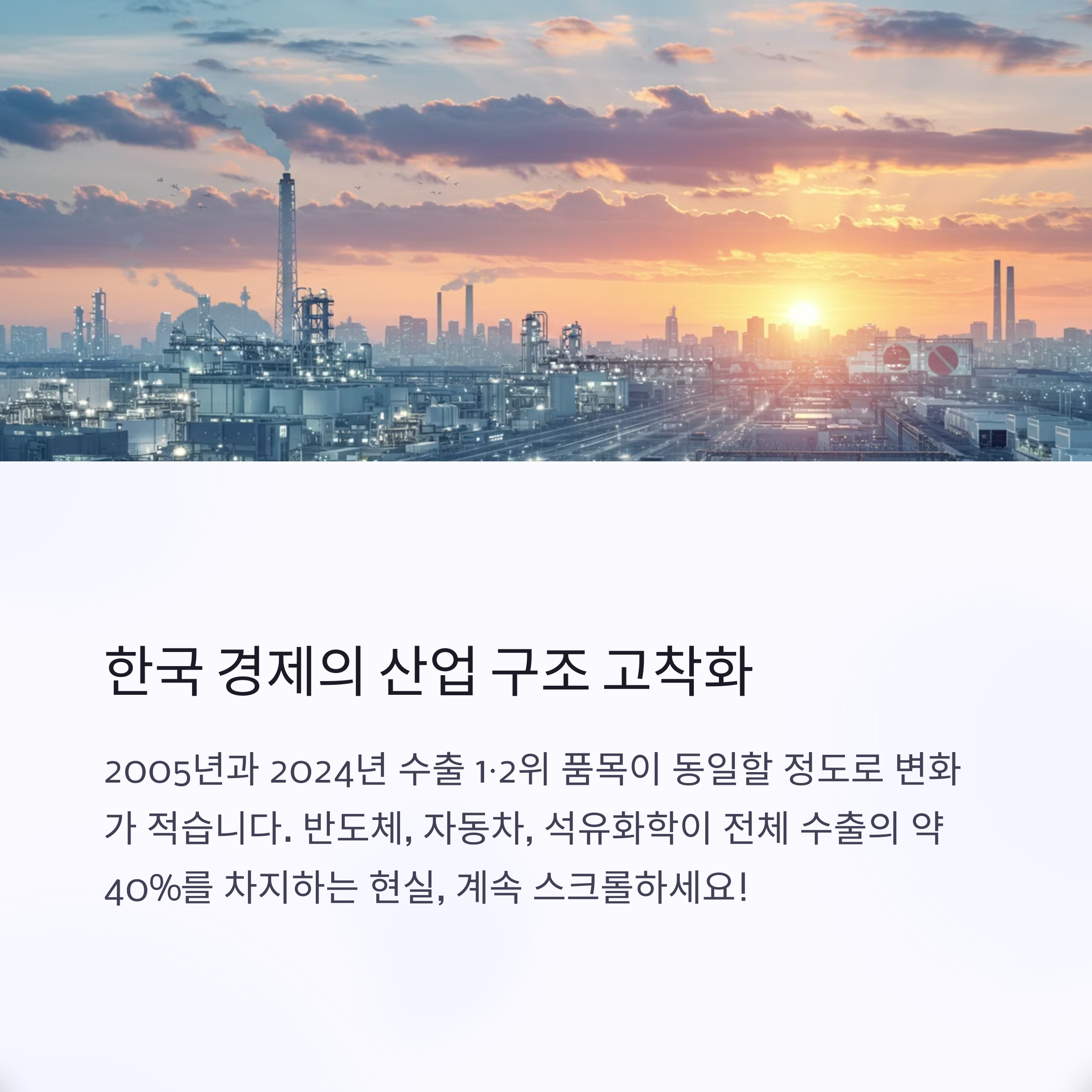한국의 산업 구조는 오랜 기간 동안 특정 품목에 집중되어왔다. 2005년과 2024년을 비교해도 수출 1·2위 품목이 동일할 정도로 변화가 적다. 특히, 반도체와 자동차, 석유화학 제품이 전체 수출의 약 40%를 차지하면서 특정 산업에 대한 의존도가 극심하다.