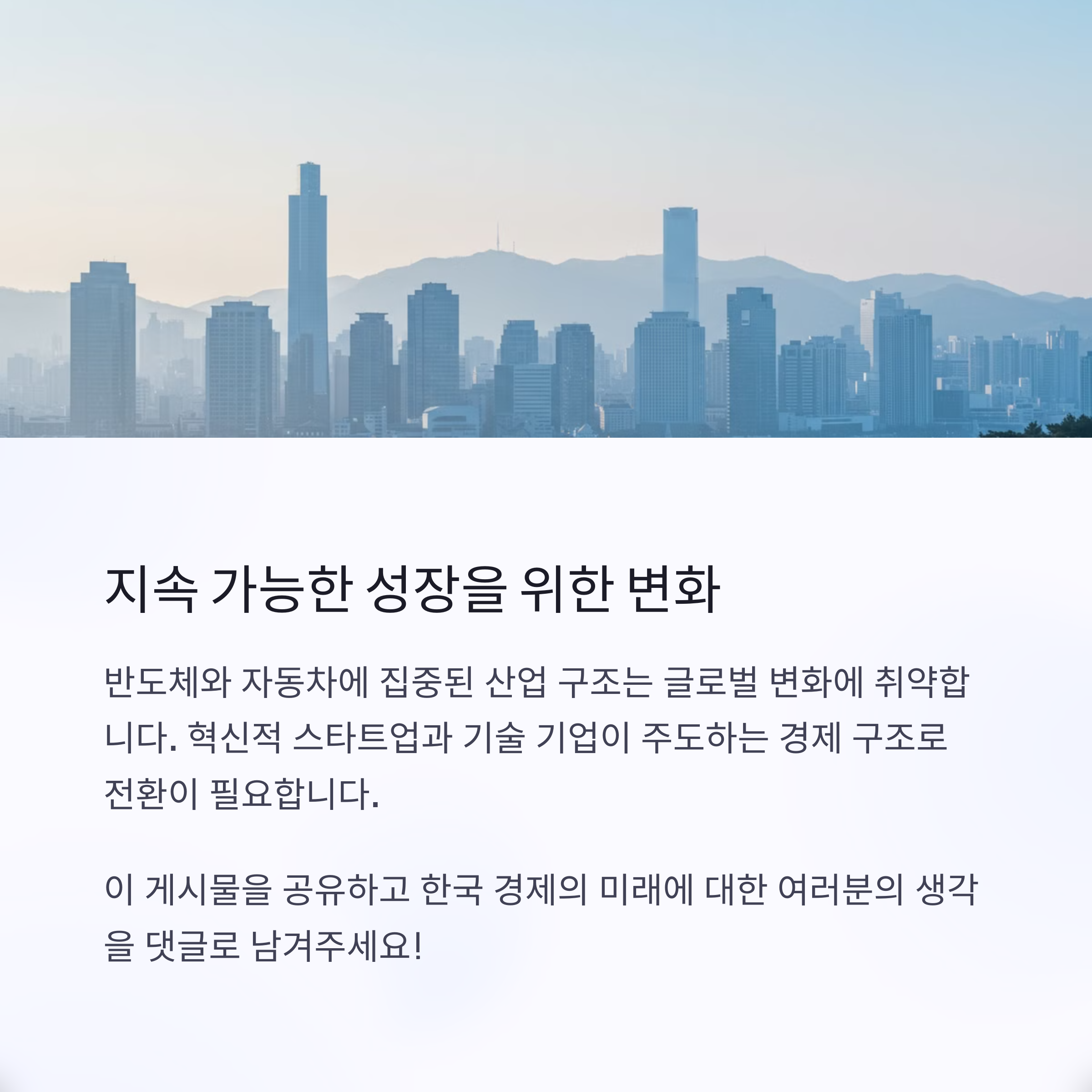 여러분은 한국 경제의 미래에 대해 어떻게 생각하시나요? 📢 한국 경제가 살아남기 위해 가장 중요한 전략은 무엇일까요? 댓글로 여러분의 의견을 남겨주세요! 😊