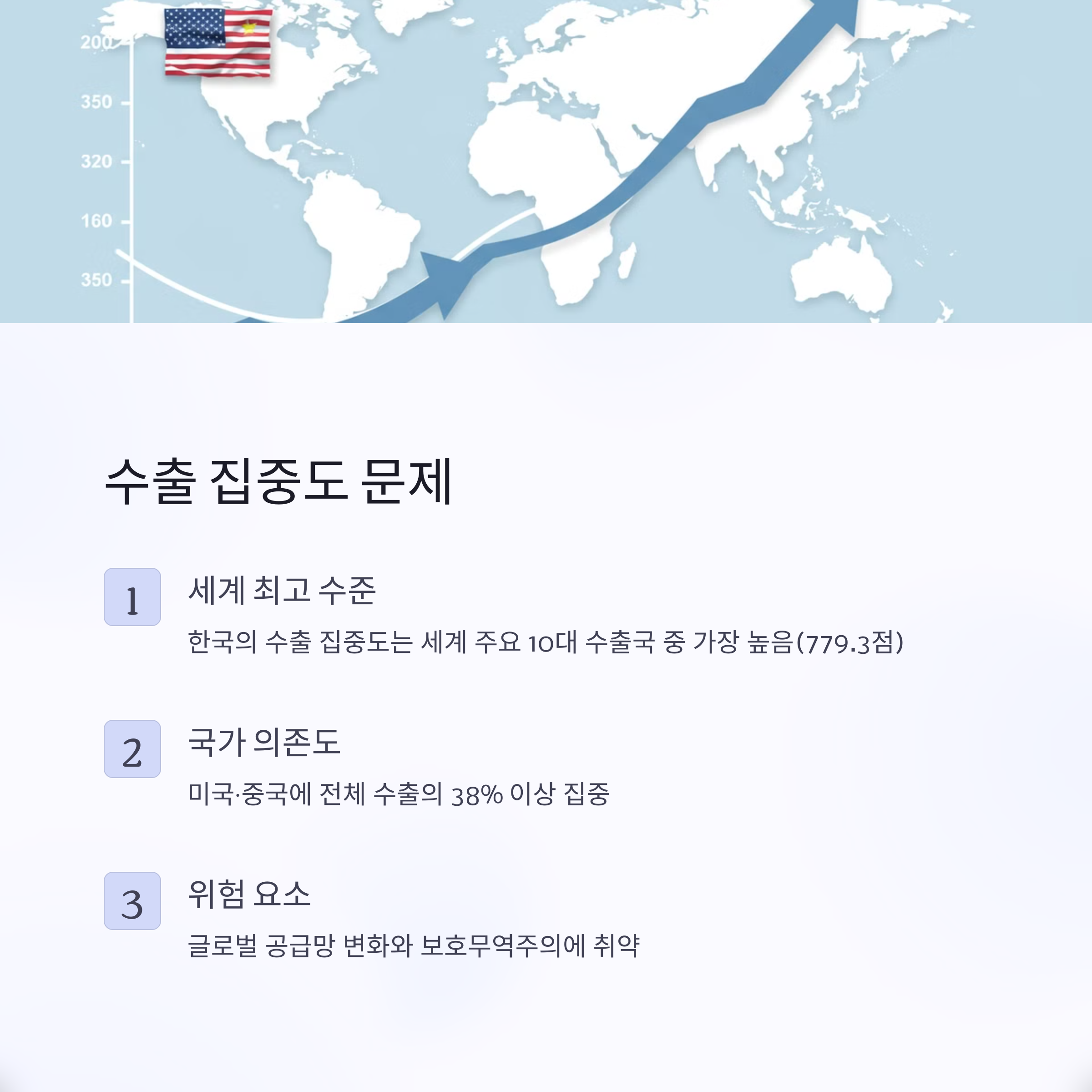 이러한 집중도 문제는 글로벌 공급망 변화나 보호무역주의 정책이 강화될 경우 한국 경제가 큰 타격을 받을 수 있다는 점에서 심각한 리스크를 안고 있다.