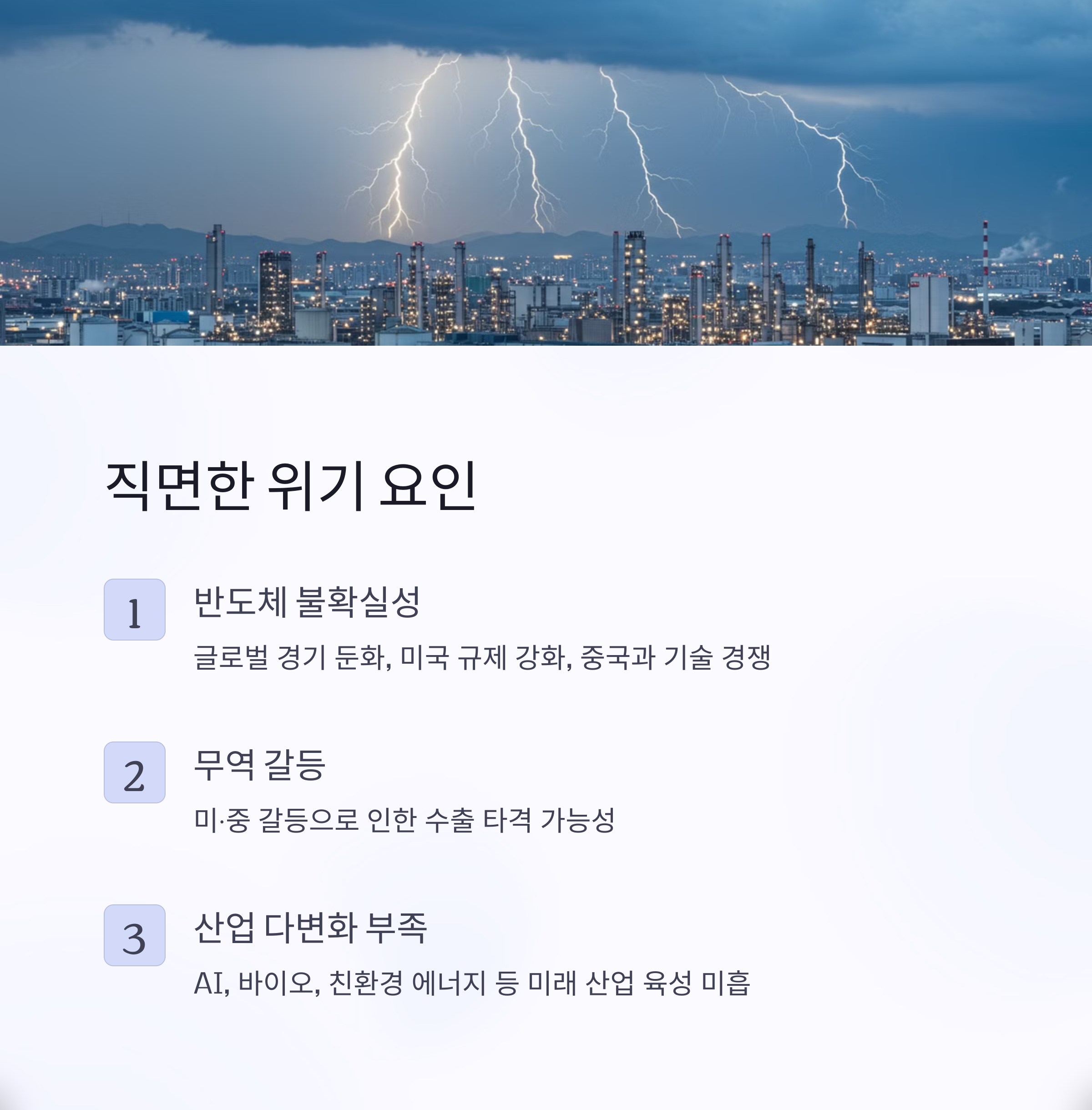 한국 경제는 지난 20년 동안 산업 구조가 고착화되면서 신산업 발굴과 성장이 정체되고 있다. 반도체와 자동차에 집중된 산업 구조로 인해 글로벌 경기 변화와 무역 규제에 대한 취약성이 더욱 커지고 있다.