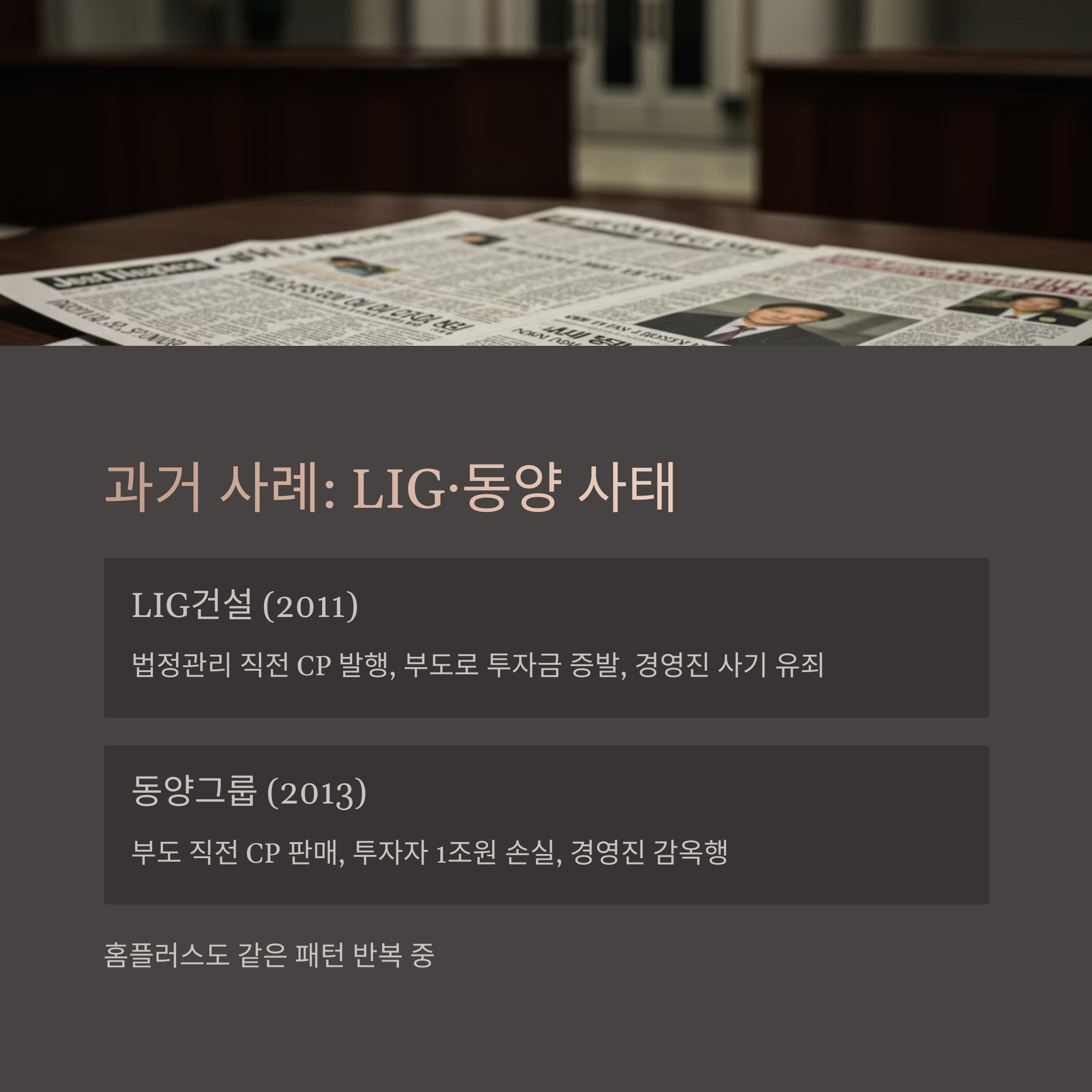 이게 단순한 기업 위기 정도가 아니라, 과거 LIG건설이나 동양그룹 사태랑 똑 닮아서 더 무섭습니다.